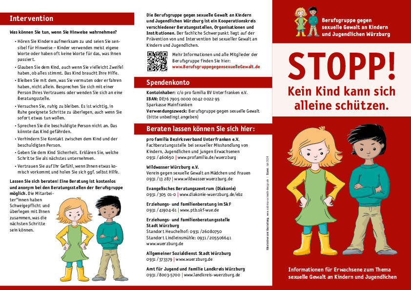 Die Berufsgruppe hat eine ausführliche Broschüre zum Thema „Vorgehen bei Verdacht auf sexuelle Gewalt an Kindern und Jugendlichen“ erarbeitet und im Juli 2021 ist die 3. Auflage erschienen. Die Nachfrage nach Druckexemplaren können ab sofort wieder erfüllt werden. Schreiben Sie uns gerne an und fordern Sie für 7€ plus Porto ein Druckexemplar an. Sie können die Broschüre auch hier downloaden.