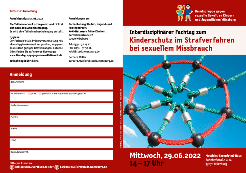 „Die Berufsgruppe gegen sexuelle Gewalt an Kindern und Jugendlichen Würzburg" veranstaltet am Mittwoch, den 29. Juni 2022 in der Zeit von 14.00 bis 17.00 Uhr einen interdisziplinären Fachtag zum Thema "Kinderschutz im Strafverfahren bei sexuellem Missbrauch“.